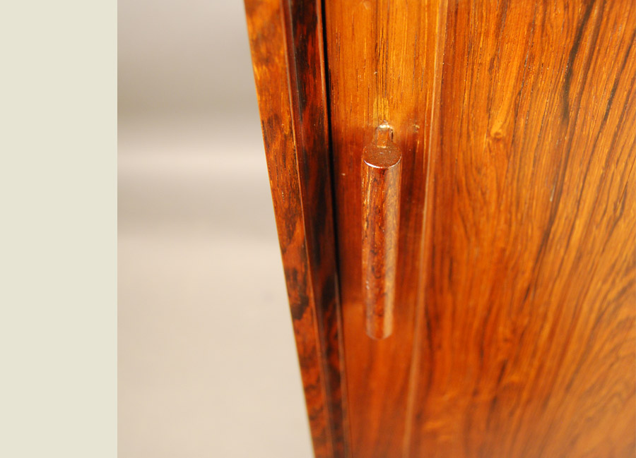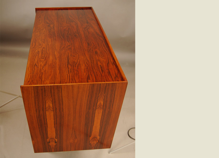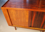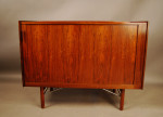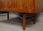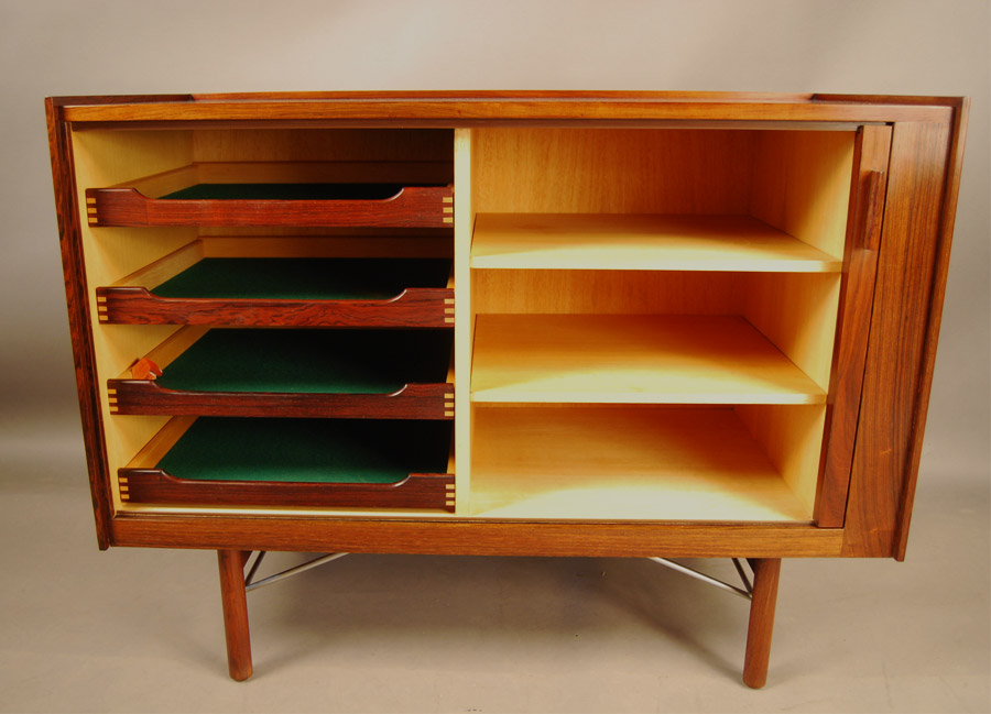 Extremely rare Ib Kofod Larsen designed tambour door cabinet. Exceptional quality. Beautifully fitted interior with shelves and felt lined drawers. Stunning grain!