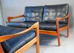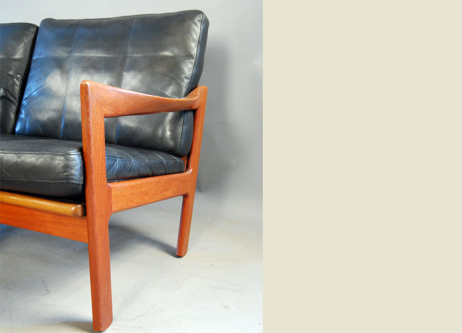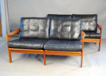 Beautiful danish modern Teak modular sofas by Illum Wikkelso for Niels Eilersen, Denmark ca. 1960. An asymmetrical teak base, original leather cushions with down filling and beautiful patina. This is a modular system, so it's possible assembling a 3-seater and an easy chair or 2x 2-seaters. Length as a two seat is 1340mm.
