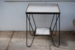 Iron and marble table suitable for indoor or outdoor use. Lower marble shelf cracked.