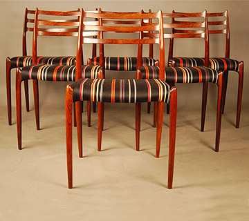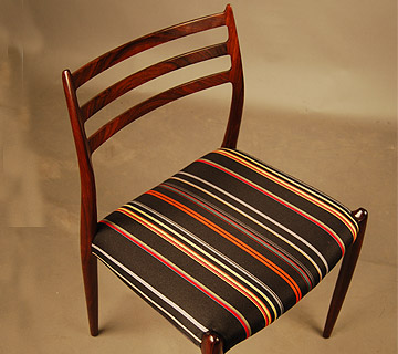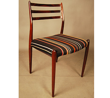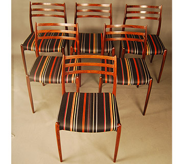 Set of six rosewood dining chairs by JL Moller. Excellent quality and condition. These chairs have just been reupholstered in Paul Smith stripes.