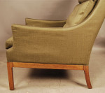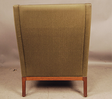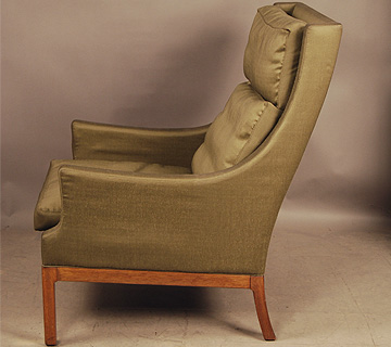 Danish highback armchair , design- Johannes Andersen.Original green silk. A very comfortable chair with down cushions.