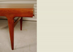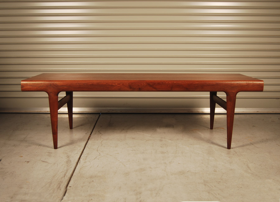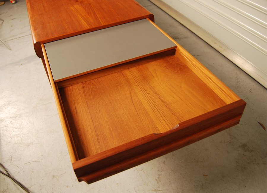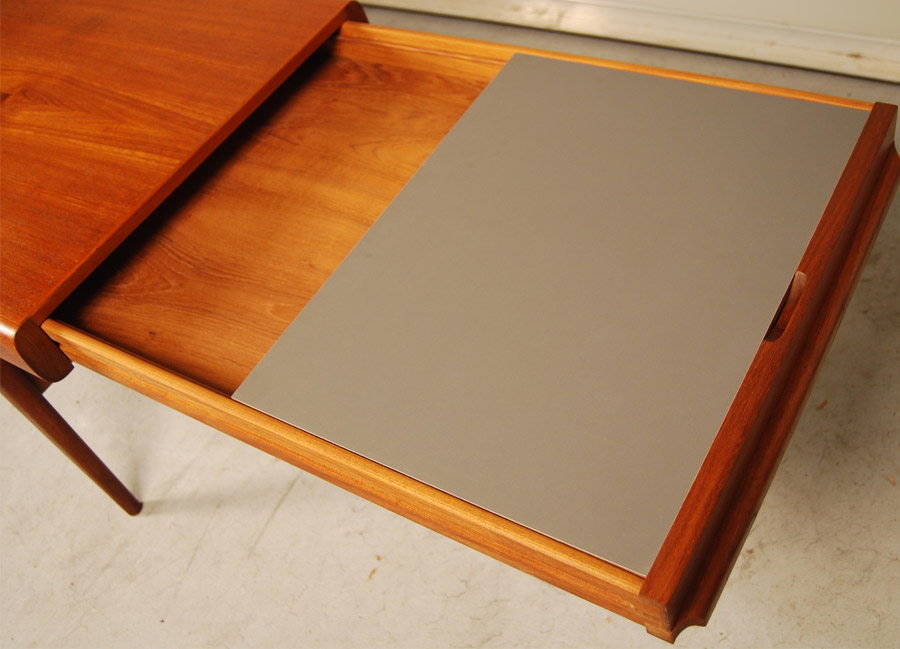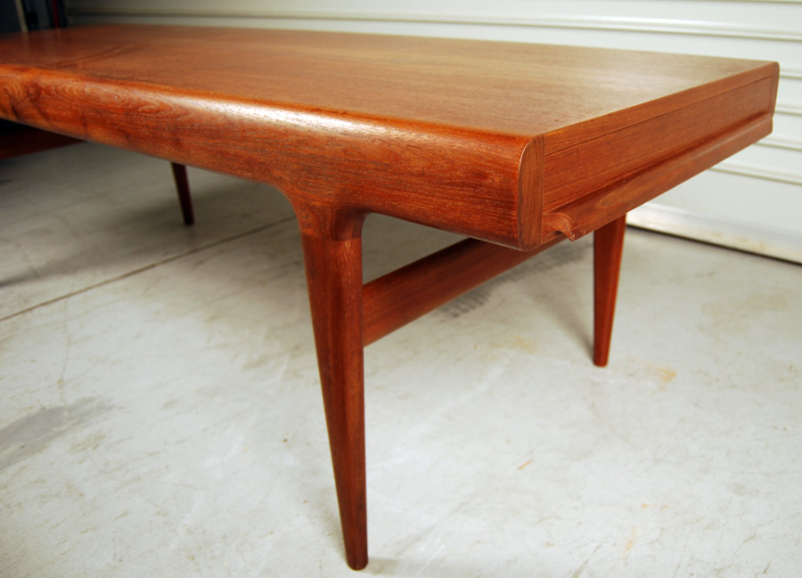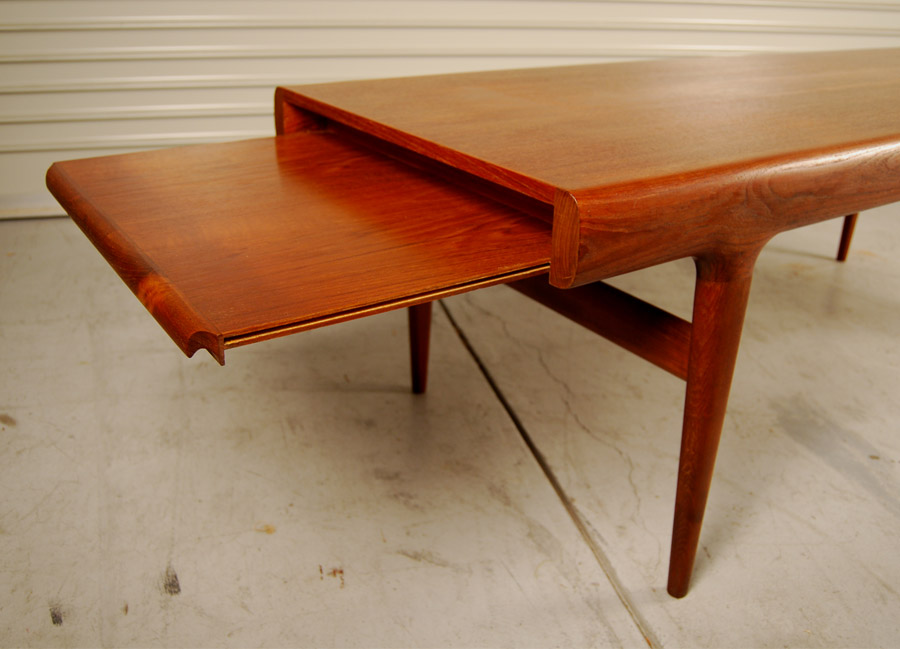 Danish teak coffee table with drawer at one end with formica insert and pull out shelf at other end. Lovely organic shape. Designed by Johannes Andersen circa 1960's and manufactured by Uldum Mobelfabrik. Excellent refinished condition.