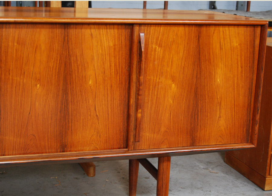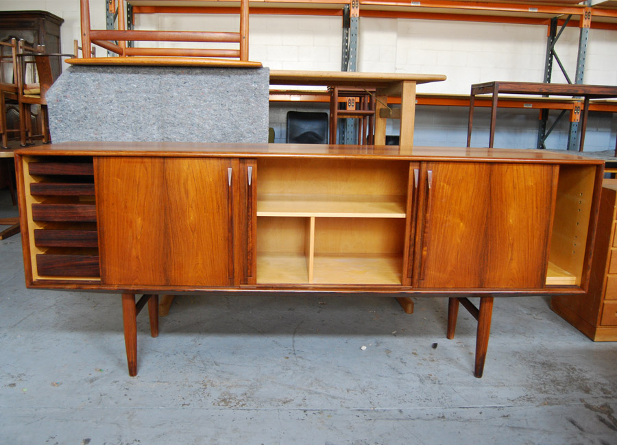 Danish rosewood sideboard by Kurt Ostervig. Superb quality four sliding door cabinet with interior drawers and adjustable shelves. Maple interior.