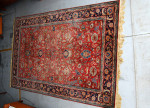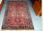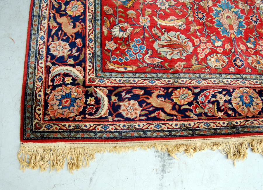 Large Persian carpet in reds with blue border, flowers and birds. Good condition apart from short fringe at one end.