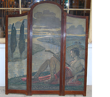 Arts & Crafts mahogany modesty screen with painted shepherd in landscape.