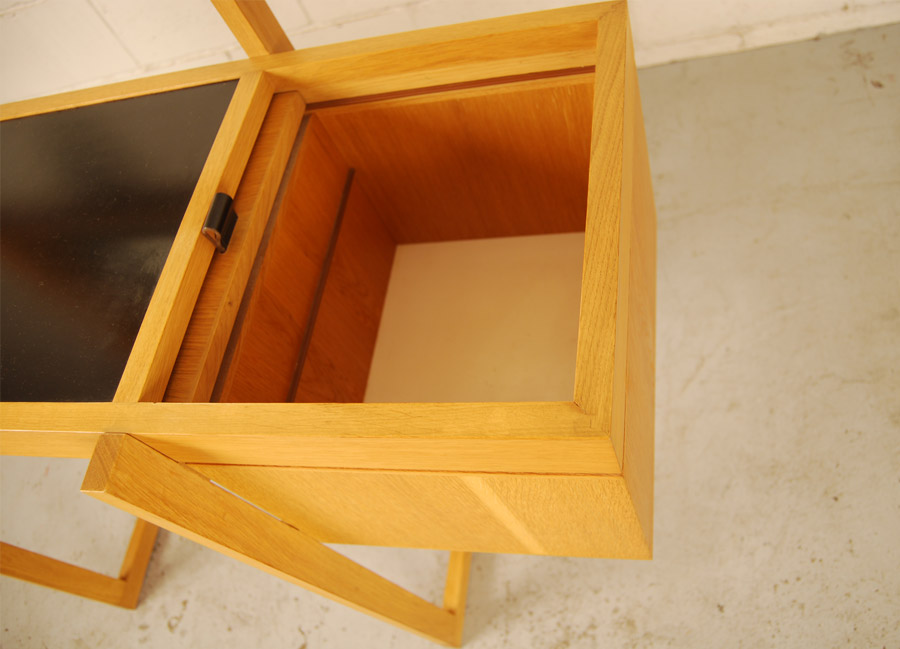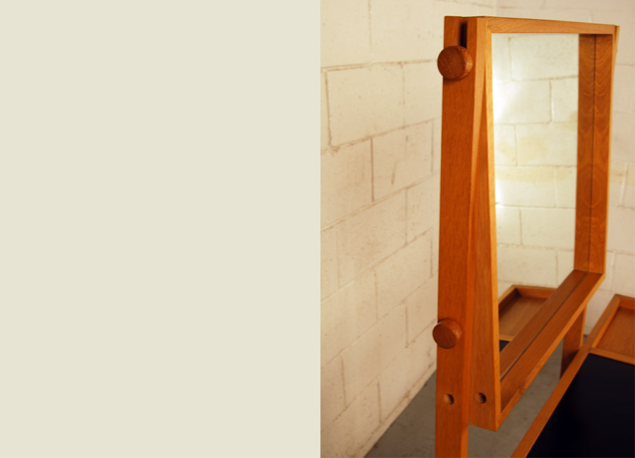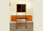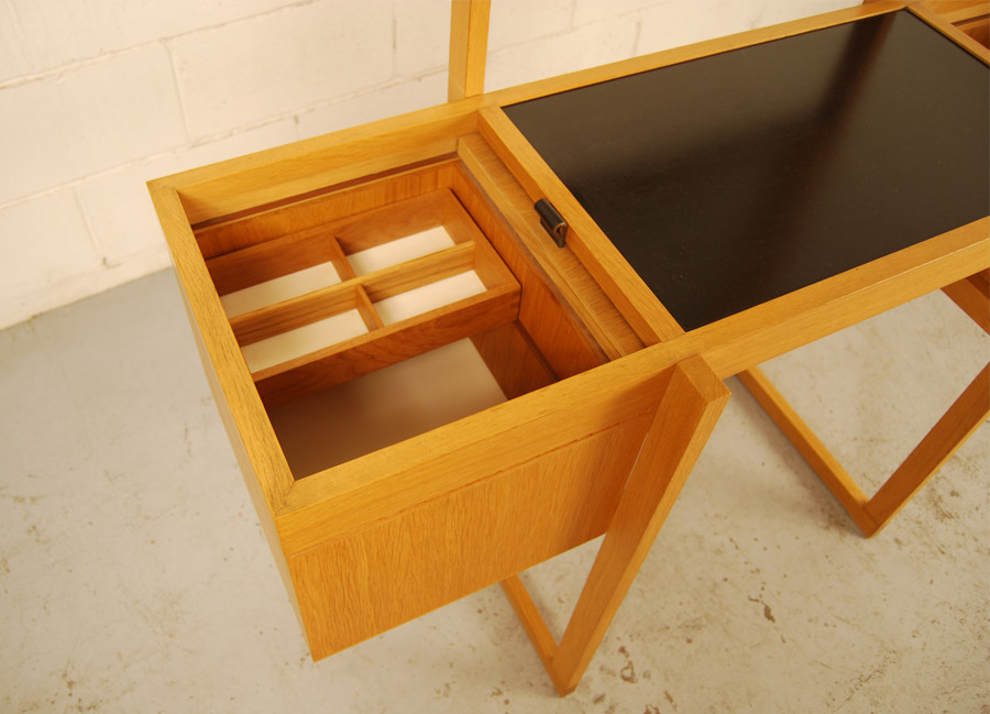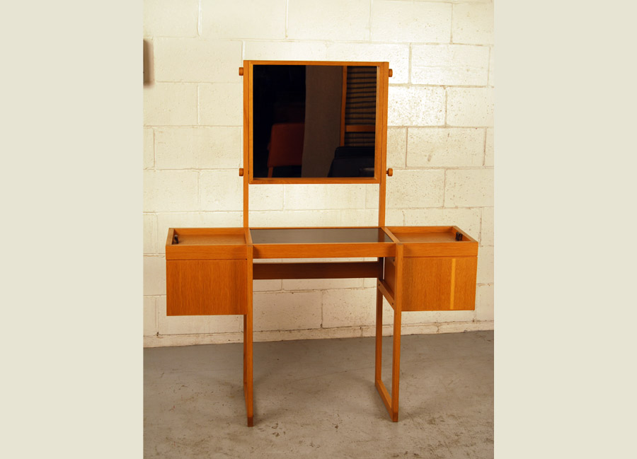 Lovely mid century oak table with vanity mirror and storage cabinets. Excellent condition.