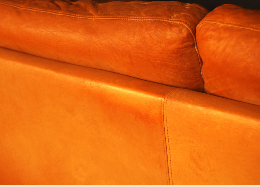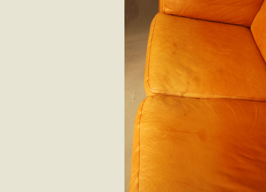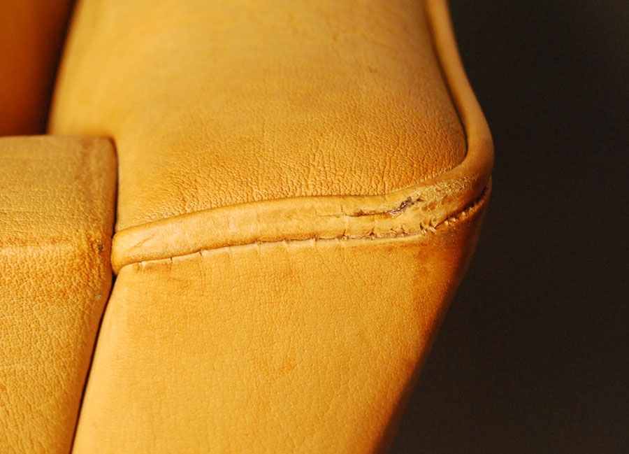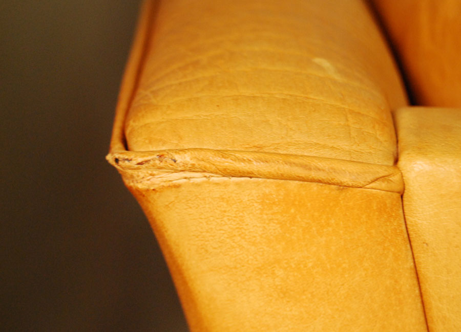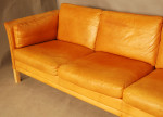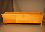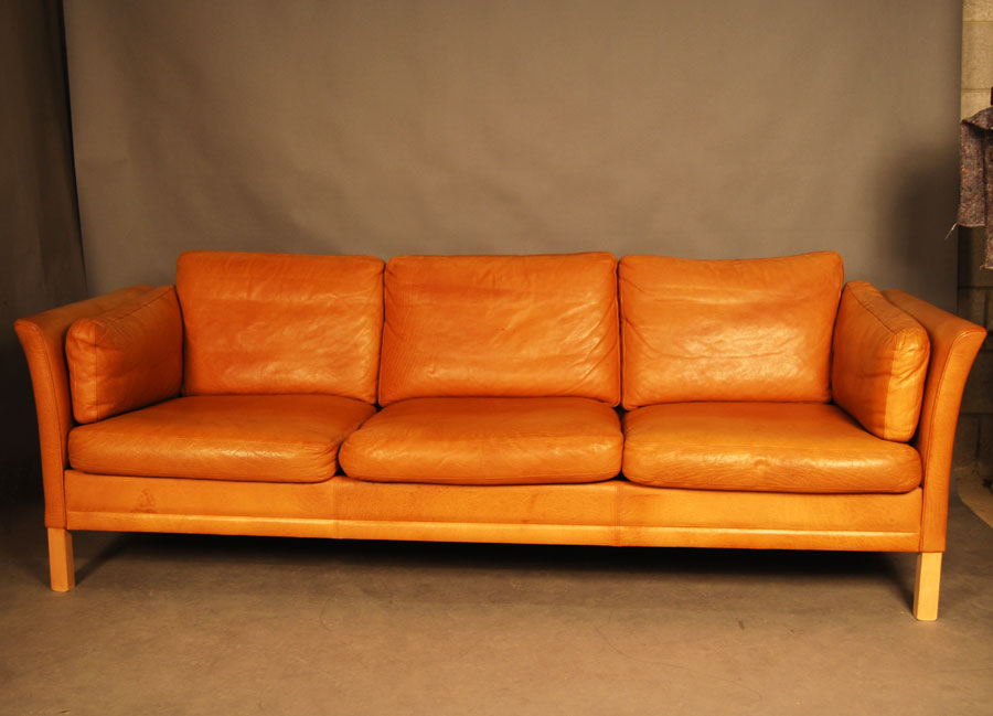 Danish leather three seat light cognac coloured sofa by Mogens Hansen. Aniline leather with patina, marks, and some age related wear to piping on back corners as shown in images.