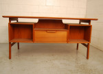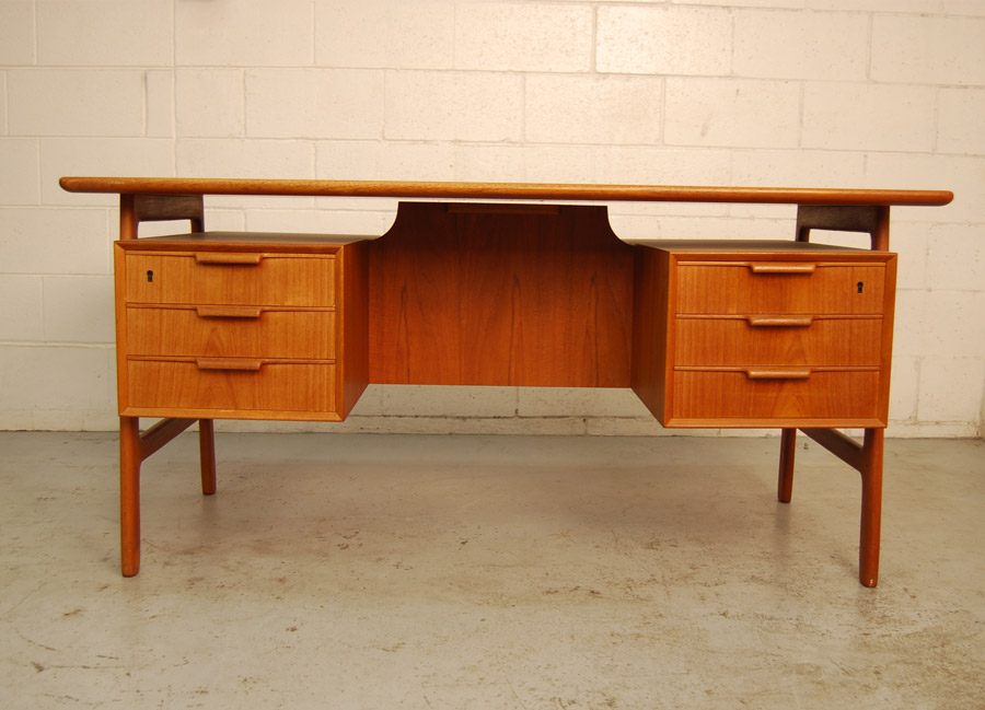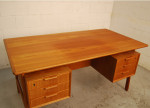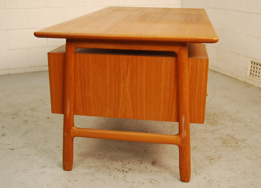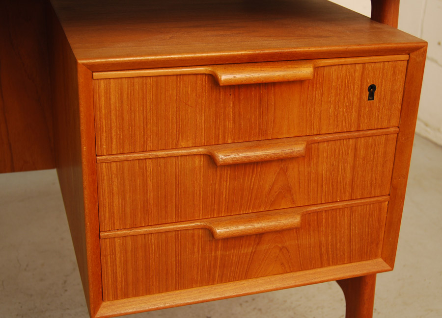 Danish teak desk by Oman Junior. Drawers on one side and open bookshelf and drop down door cabinet on the other. Shown as found, price includes restoration.