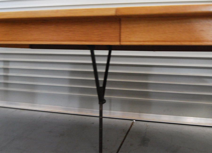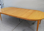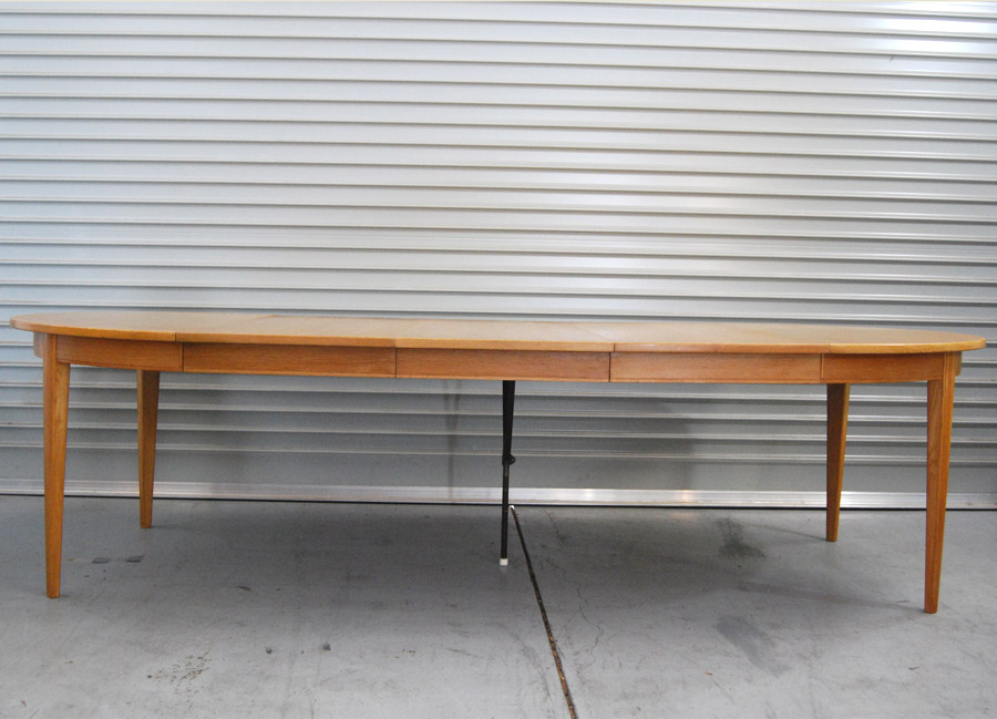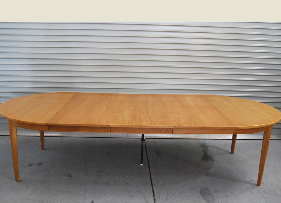 Danish oak extension table by Omann Jun. Makers label underneath. A circular table with 3 x 500mm extension leaves all with side rails. Full extends to 2700mm or a circular table of 1200mm diam. Some age related patina. One leaf has some wear to veneer. Table has a drop down legto support when fully extended.