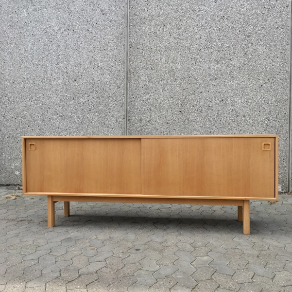 Danish low oak sliding door sideboard by Omann Junior.