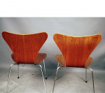A pair of teak Seven Series chairs designed by Arne Jacobsen. Patina and age related wear.