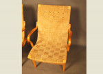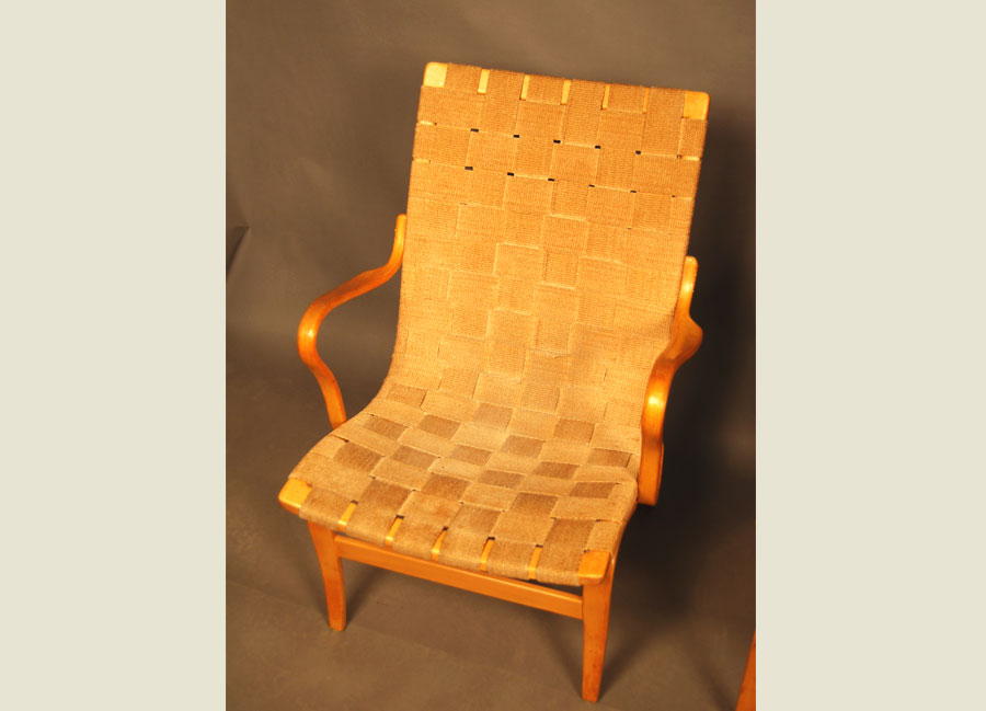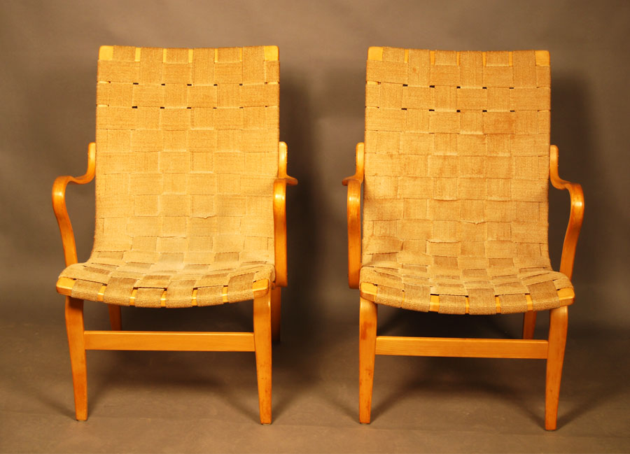 A pair of Bruno Mathsson designed beech easychairs with original webbing. Some marks, patina and fraying to webbing. Stamped underneath.