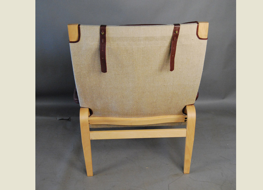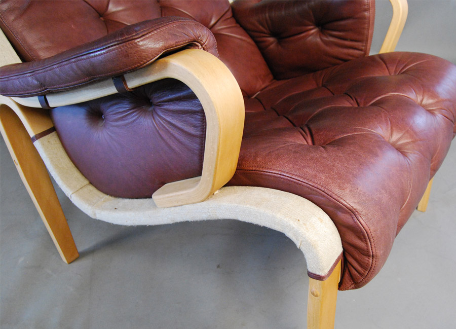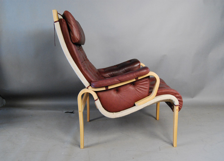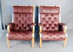 A pair of Danish Bruno Mathsson style beech and leather armchairs.