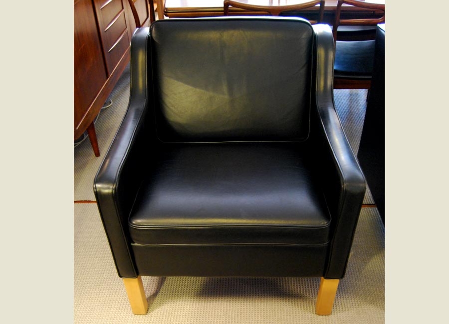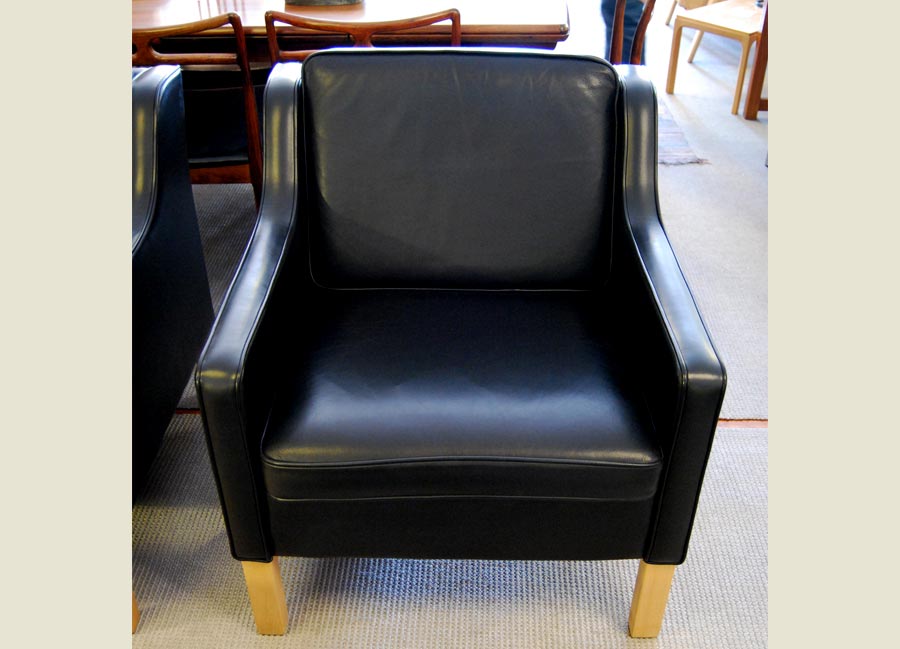 A pair of Danish black leather lounge chairs in great condition. Approximately only ten years old, they are like new. Excellent quality.