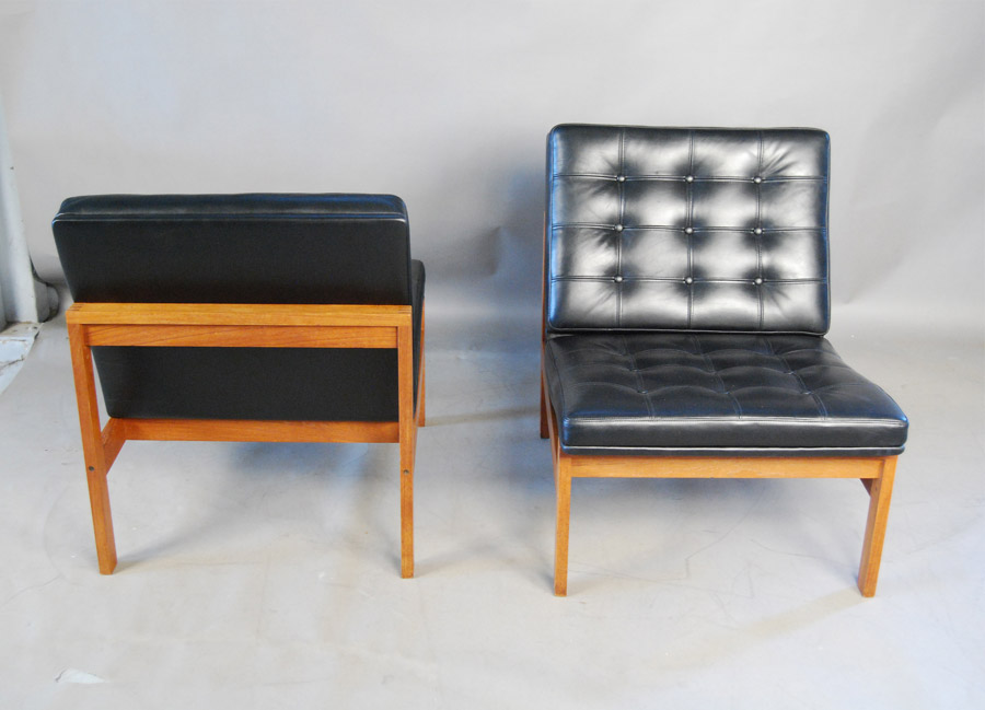 France and Son pair of easychairs which have been fully reupholstered in black Italian aniline leather.