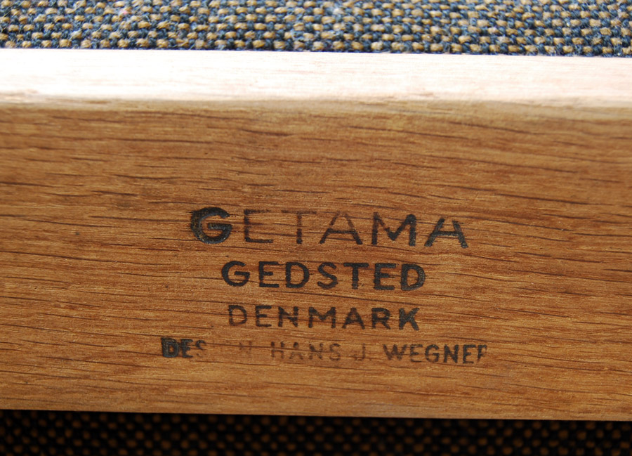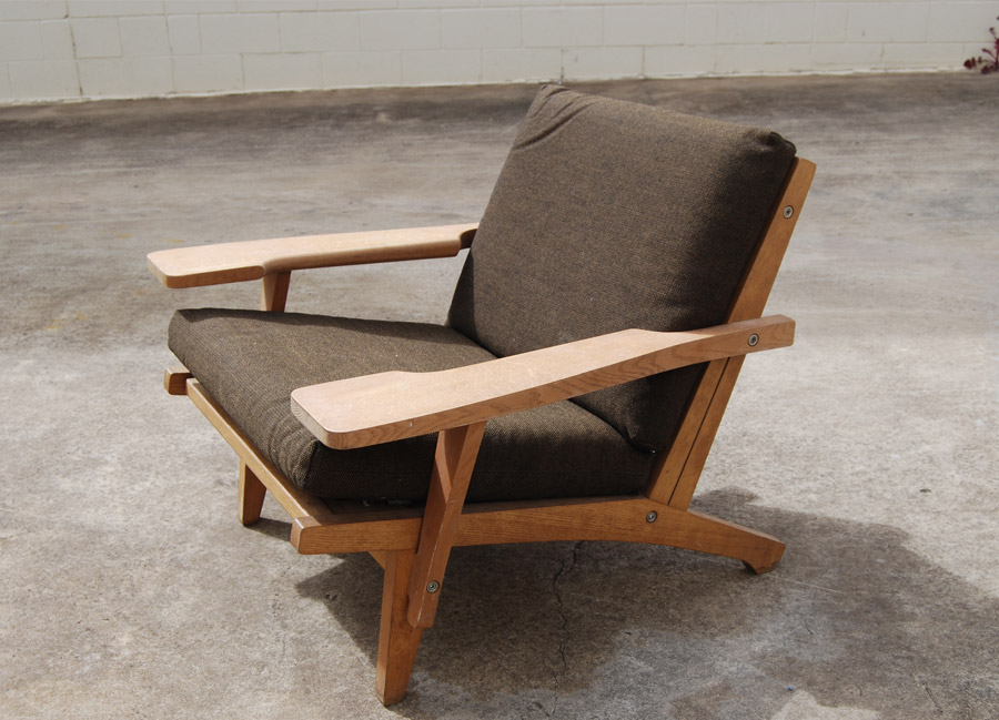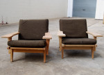 A pair of oak (soap treated) easychairs designed by Hans Wegner in 1969. Manufactured by Getama (model no. GE375). Re-upholstery labour included in price. Fabric of your choice at extra charge. (2 metres required.) $2,300 per chair.