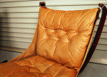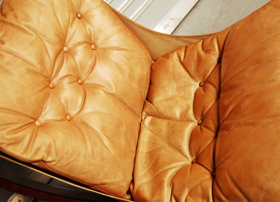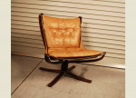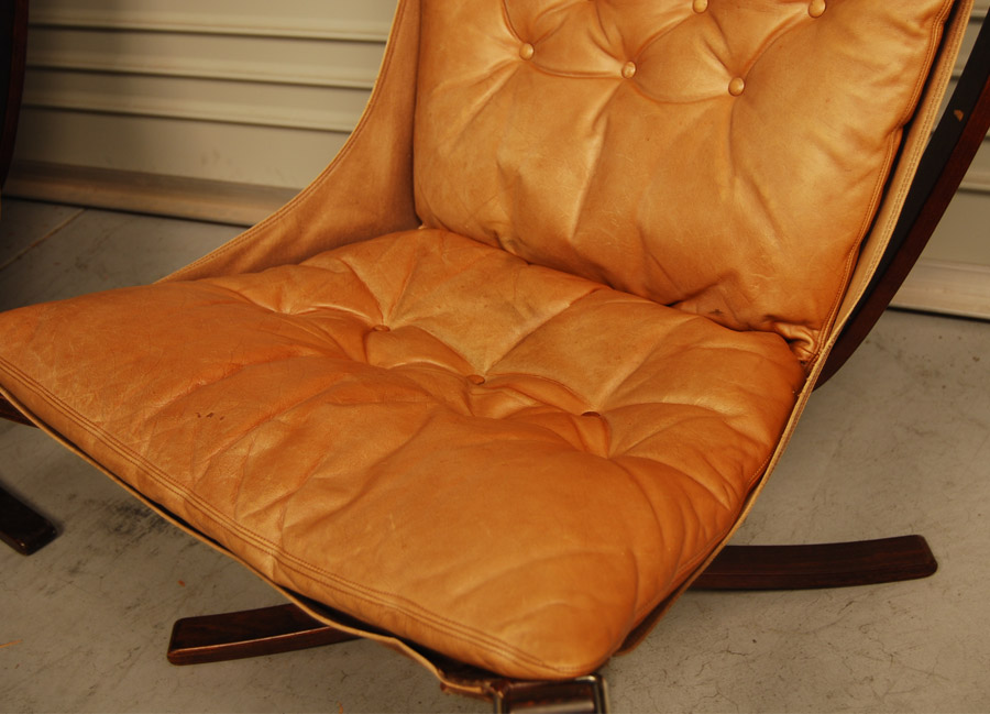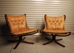 A pair of leather and stained beech easychairs by Norwegian designer Sigurd Ressel. Leather has been cleaned and conditioned and has some marks and patina. Very comfortable seating!
