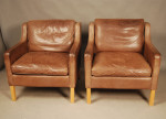 A pair of Danish brown leather armchairs by Stouby. Leather with patina. To be sold as a pair.