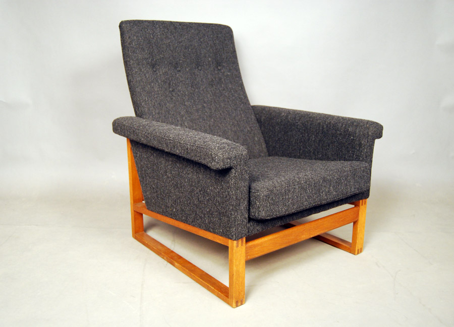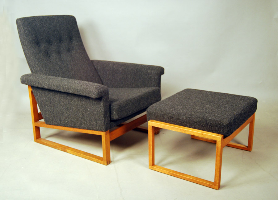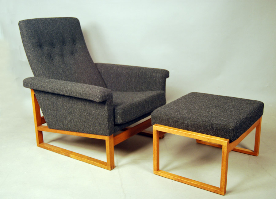 Extremely rare armchair and matching footstool designed by Borge Mogensen in 1961 for Fredericia Stolefabrik. Model no. 160 and 161. It has been completely reupholstered with all new high quality foam and Pirelli rubber webbing internally. It has been recovered in Kvadrat 'Hallingdal' wool from Denmark. This is a superb set which we have not seen before.
