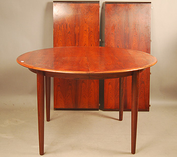 Danish rosewood round extension dining table with two leaves @ 500mm each. Fully extended length is 2200mm. Very good quality table. Shown as found, price includes restoration.