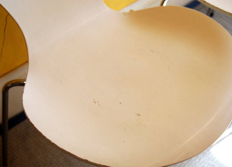 Set of four Seven Series chairs designed by Arne Jacobsen. This set manufactured 1989. Marks,cratches and crazing to paintwork.