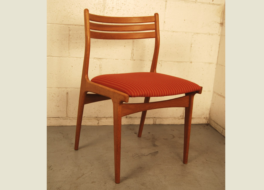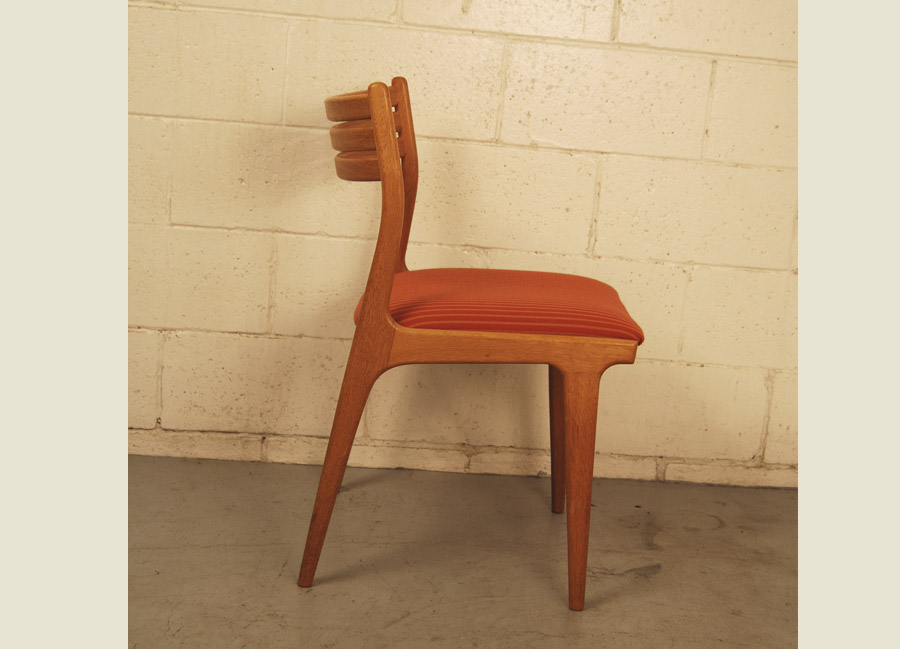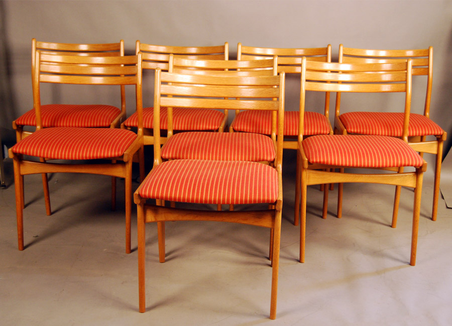Set of 8 oak Johannes Andersen dining chairs in original fabric.
