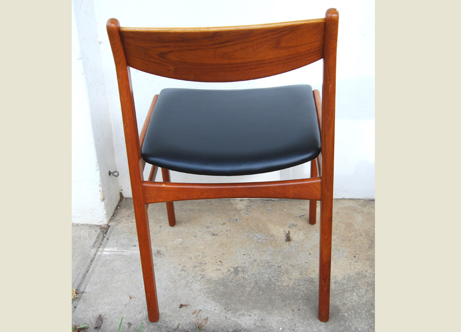 Beautiful set of eight Danish teak chairs, fully reupholstered in new Italian aniline black leather. Very comfortable chairs.