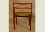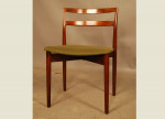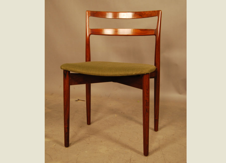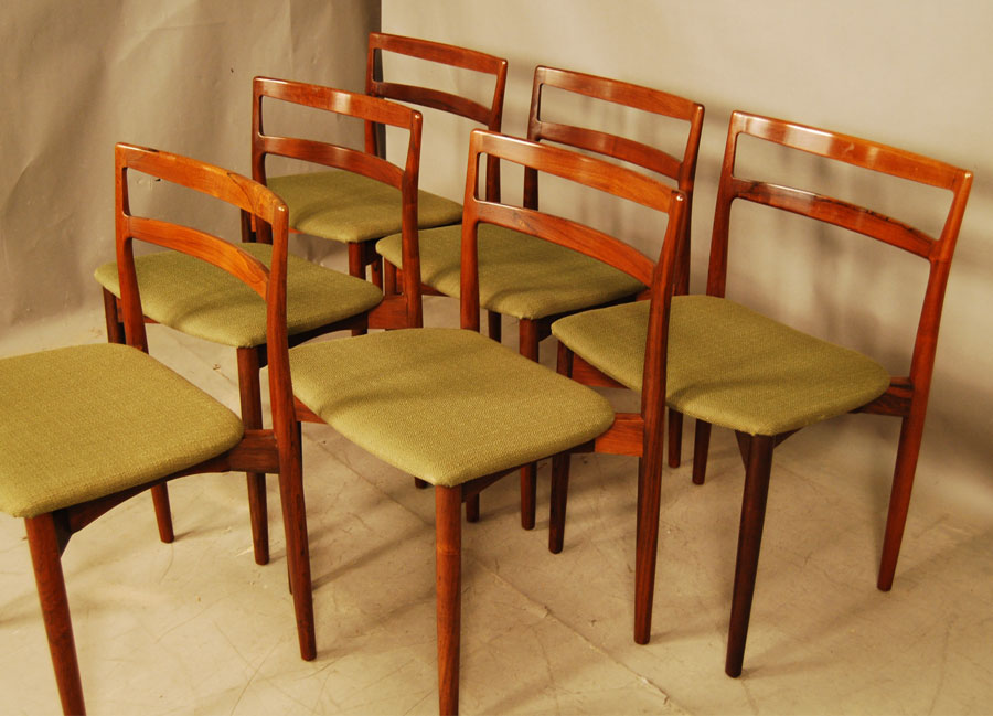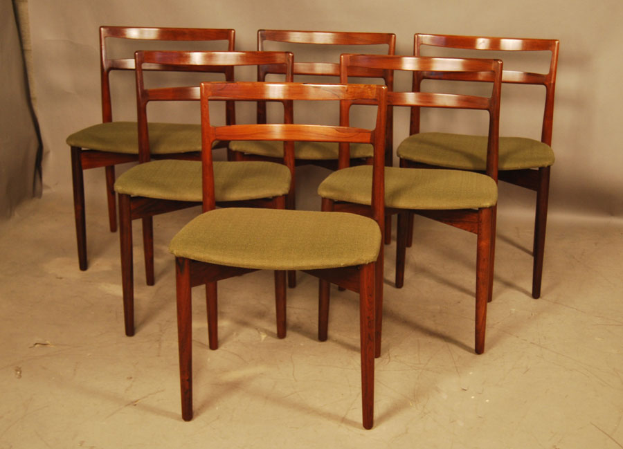 Set of six Danish rosewood dining chairs by Harry Ostergaard with original green wool upholstery. Re-upholstery can be arranged at extra charge.
