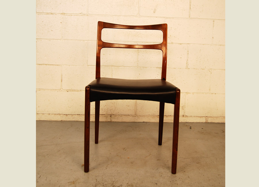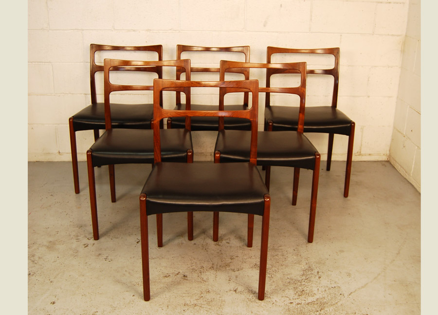 Set of six Danish rosewood dining chairs fully reupholstered in black Italian aniline leather.
