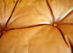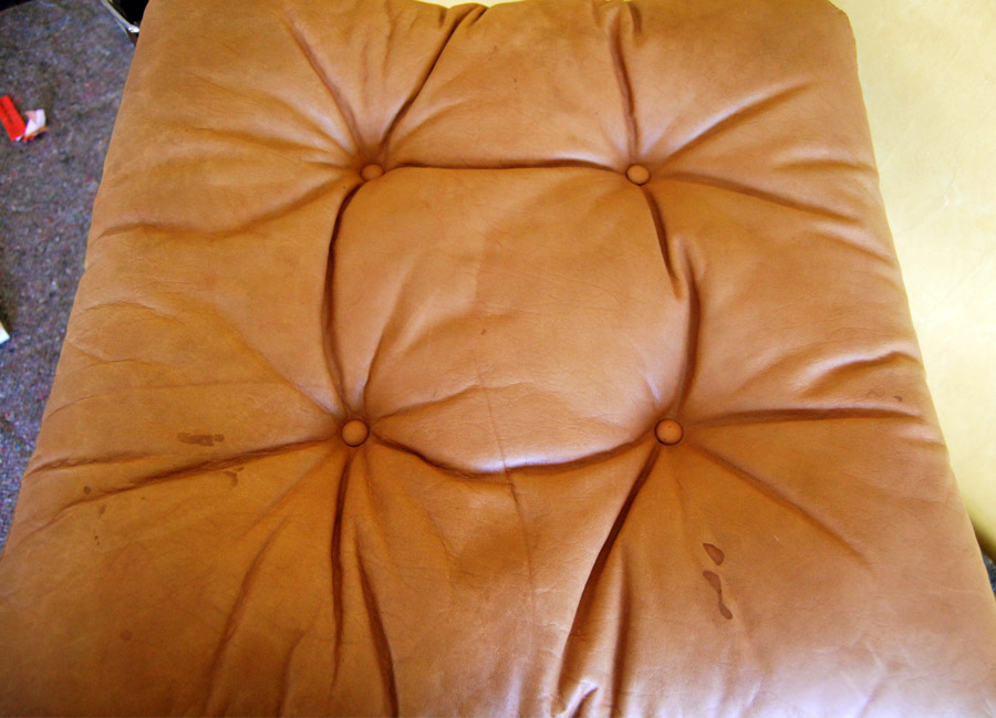 Falcon Ottoman by Sigurd Ressell in light tan patinated leather. Marks and stains.