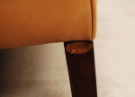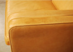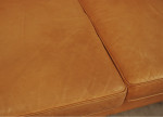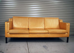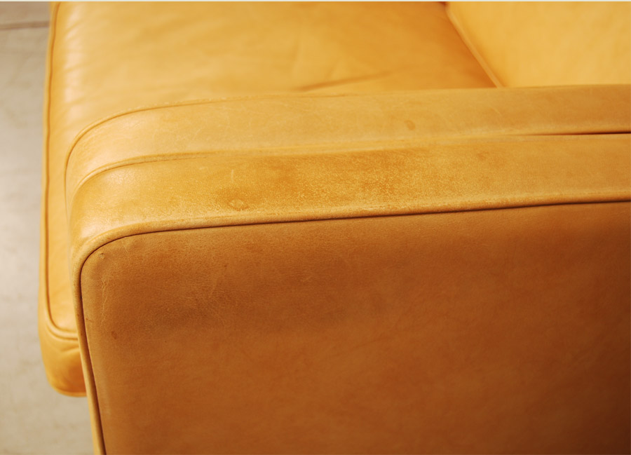 Danish tan leather "Stouby" three seat sofa. Marks and patina to leather. Smoke odour from smoking house.