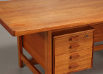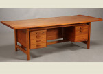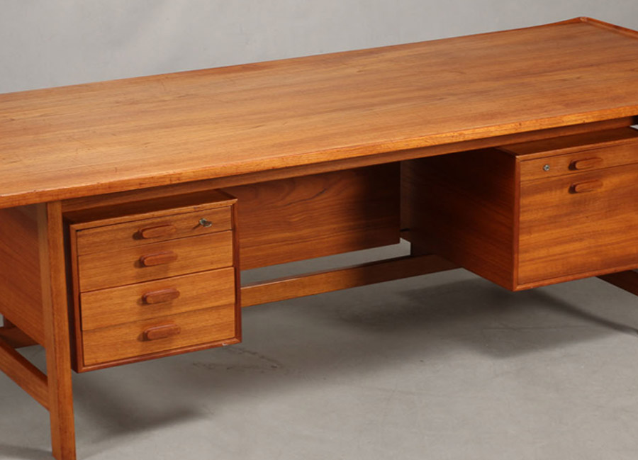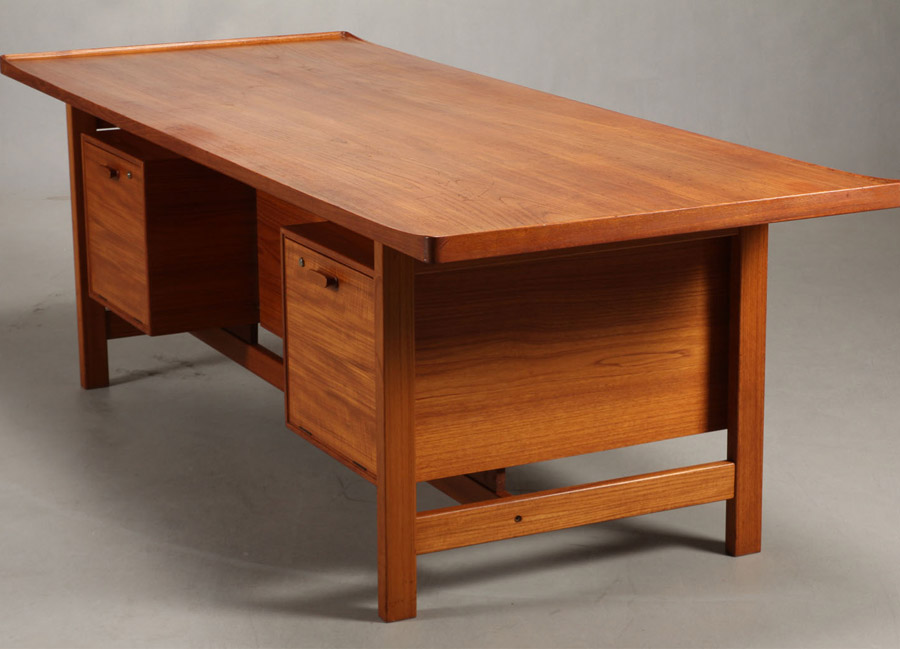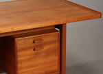 Very large Danish teak desk design bySvend Madsen and Cabinetmaker Sigurd Hansen. Excellent quality and a beautiful design with lip around edge of desk top. Age related patina.