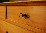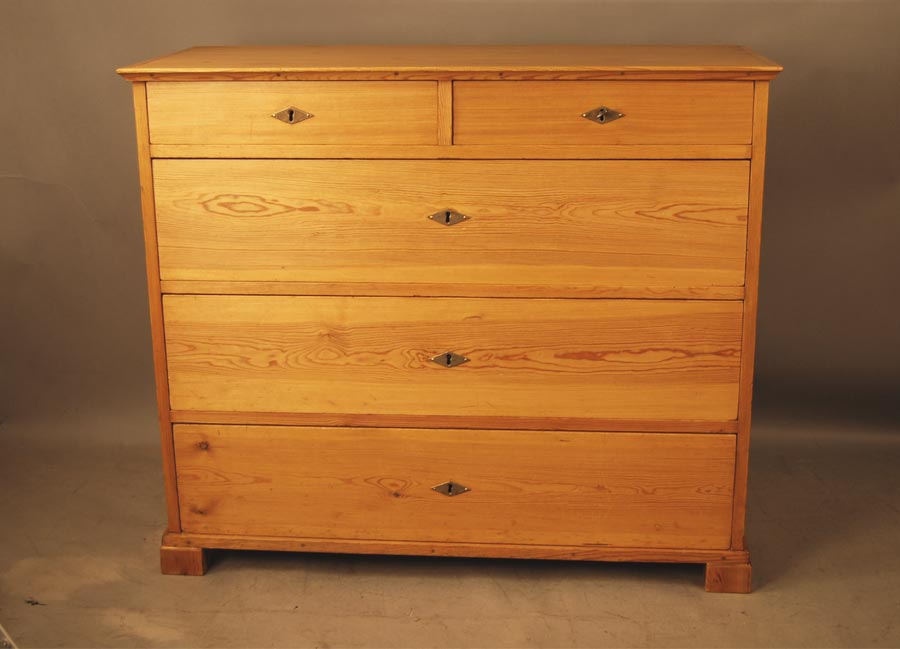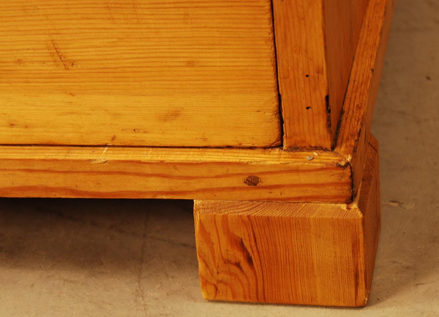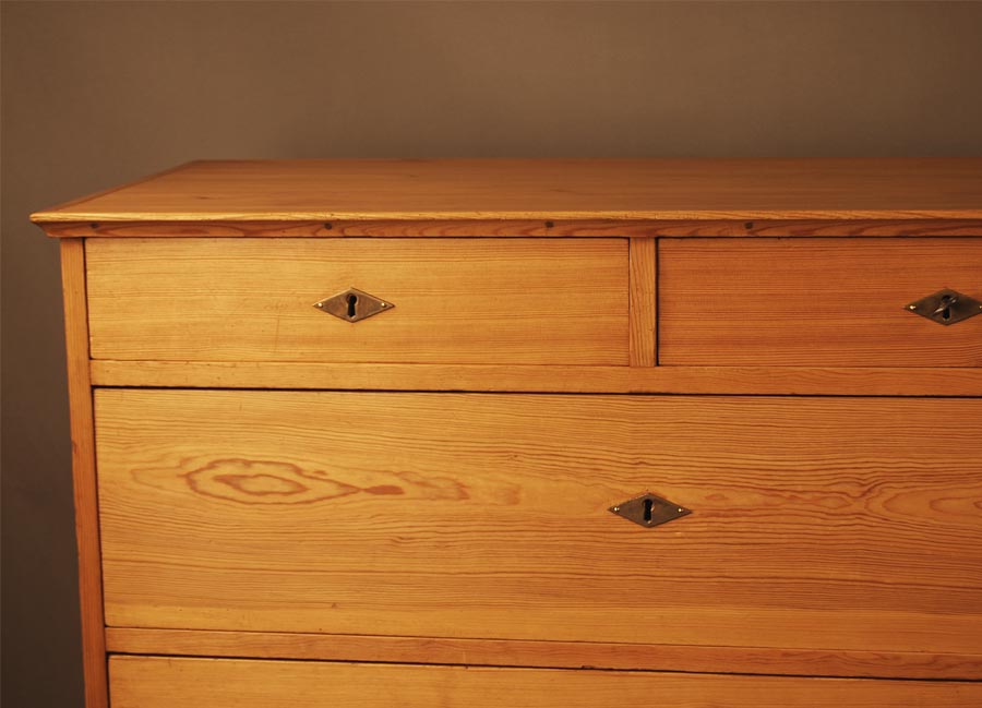 Swedish antique pine chest of five drawers on block feet. Brass diamond escutcheons, original key.