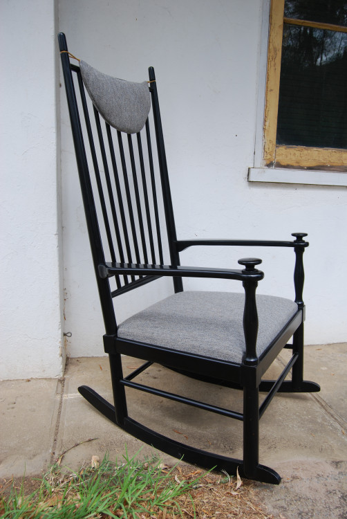 "Isabella" rocking chair from Gemla furniture company, Diö, Sweden. Reupholstered in grey Savak wool.