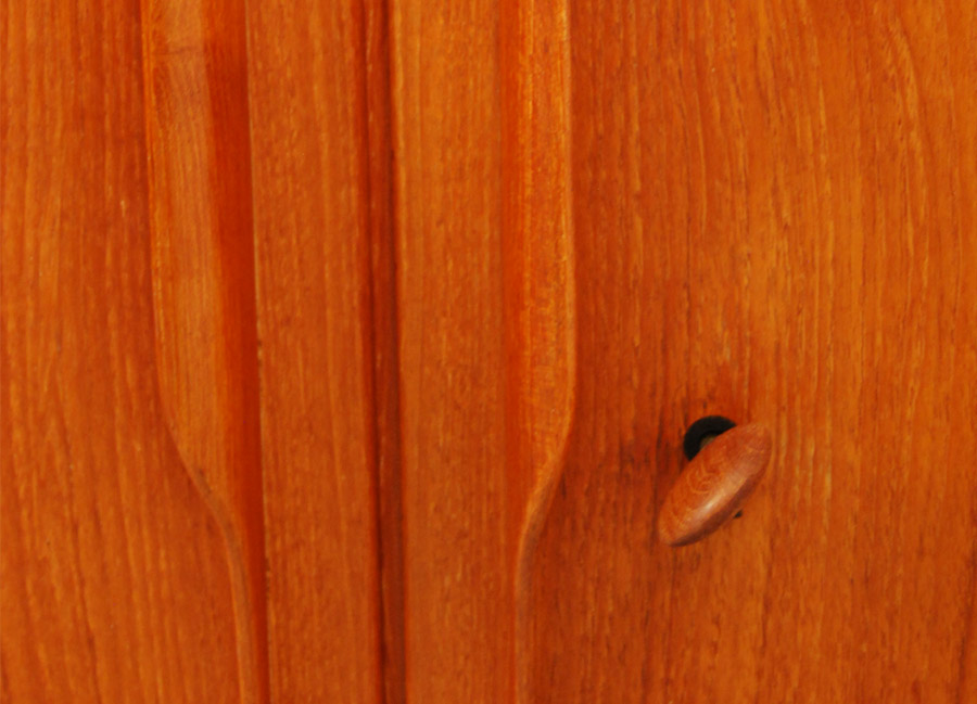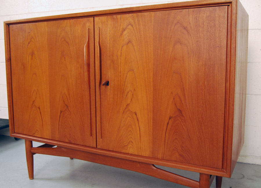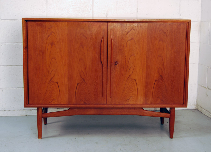 Swiss teak two door buffet. Stunning quality and detail, with original teak handle key.