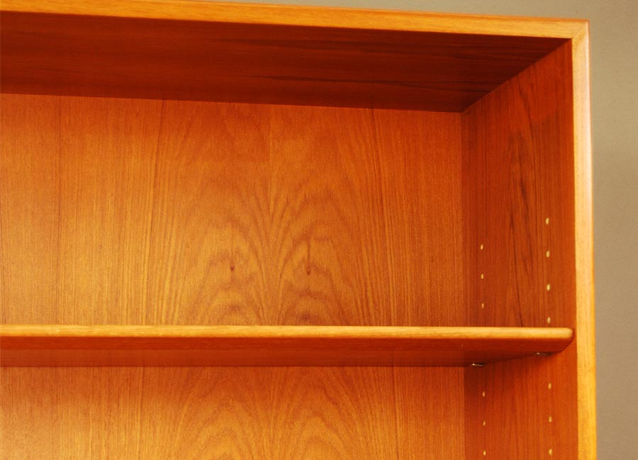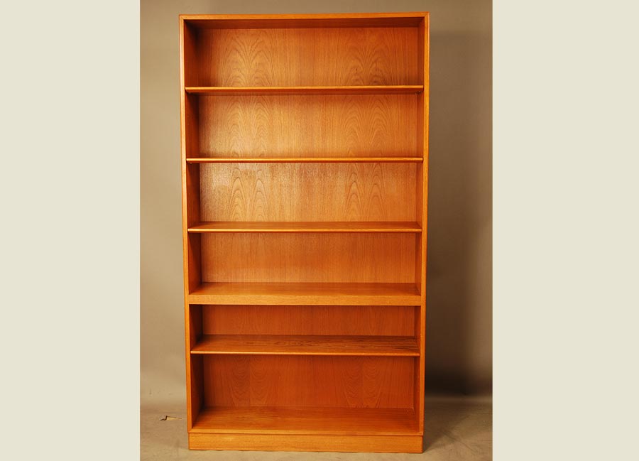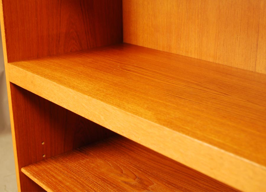 Freestanding Danish teak bookcase on plinth base. One shelf is fixed and the rest are adjustable height. Good condition.
