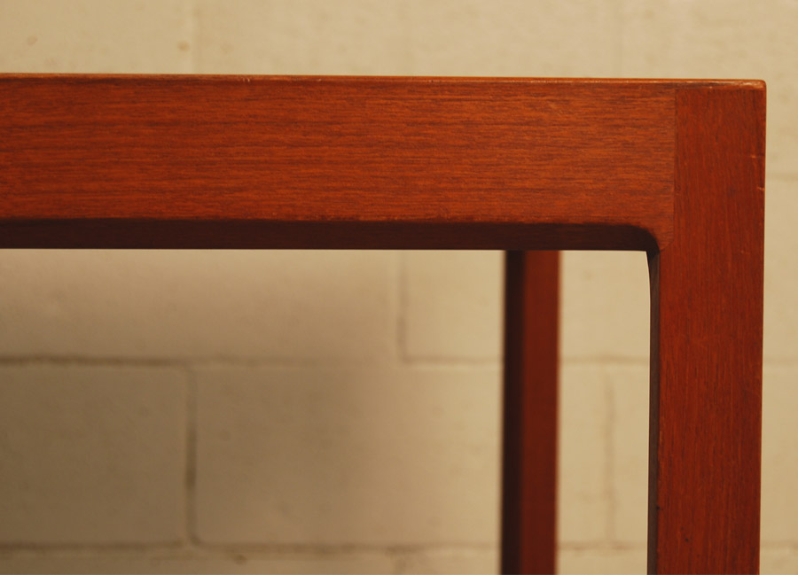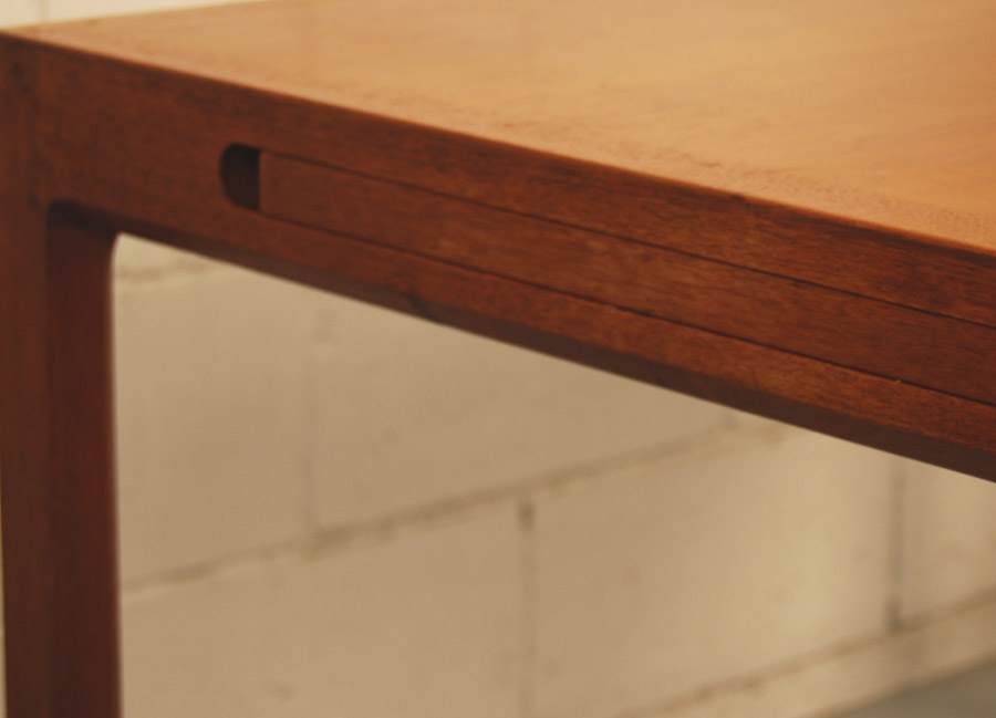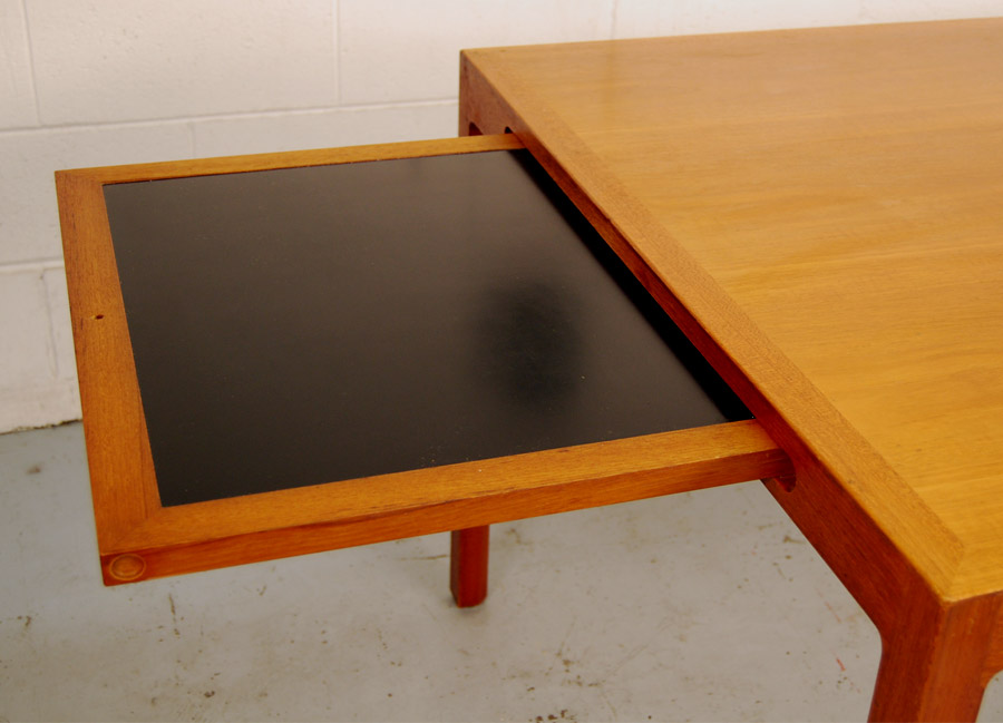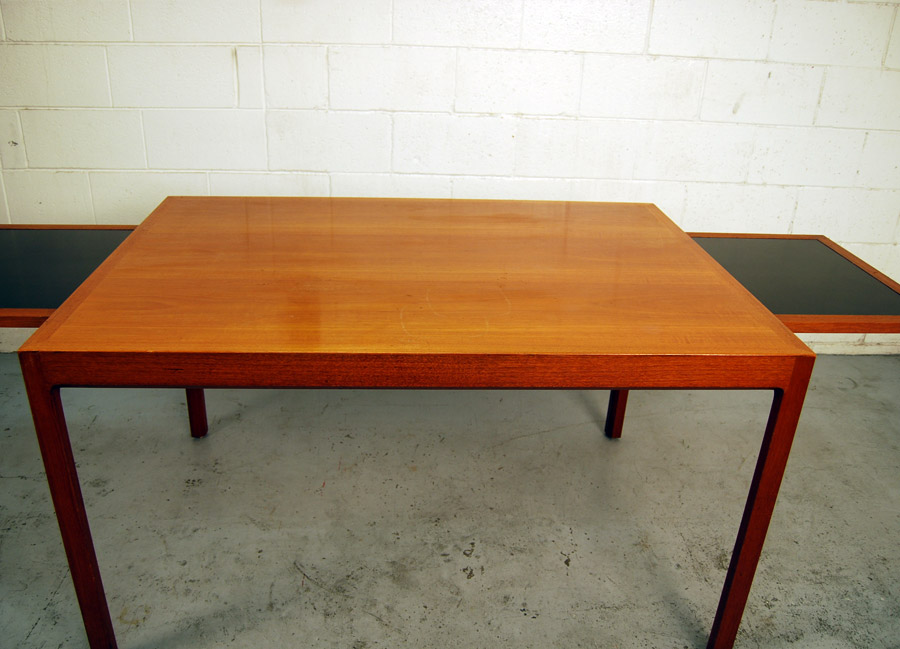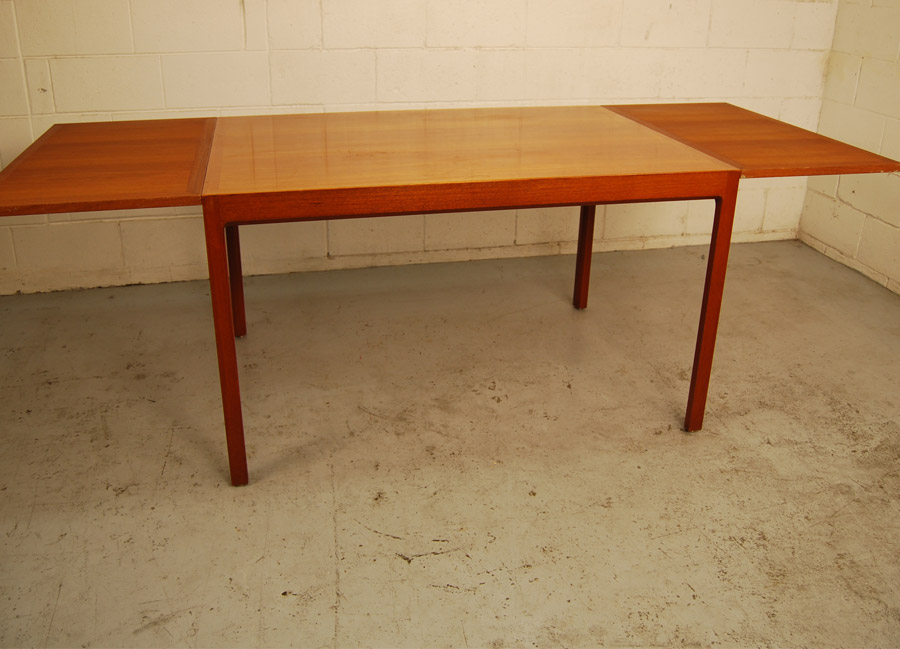 Danish teak extension table designed by Berndt Petersen and manufactured by Worts Mobelfabrik, Denmark. Makers stamp underneath. The table has two pull out slides with formica tops at each end which can be used to put things on or the extensions sit on top of these to increase the table length to 2295mm fully extended. A very beautifully designed table and the price includes restoration.