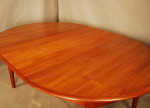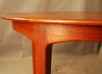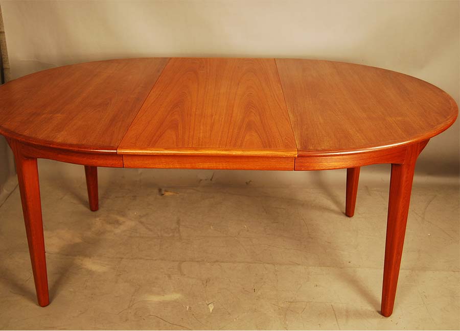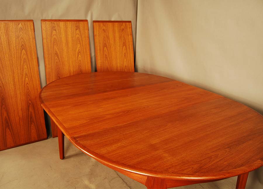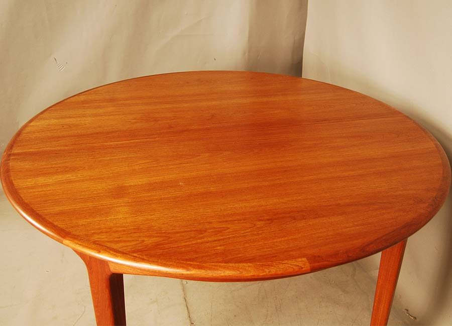 Danish teak circular extension dining table designed by Henning Kjaernulf. Manufactured by Edmund Jorgensen. An excellent quality large dining table with removable leaves and a drop down centre leg for extra support when table is fully extended. Makers badge underneath. Some slight colour variation between leaves and marks and scratches consistent with age. Table has been refinished.